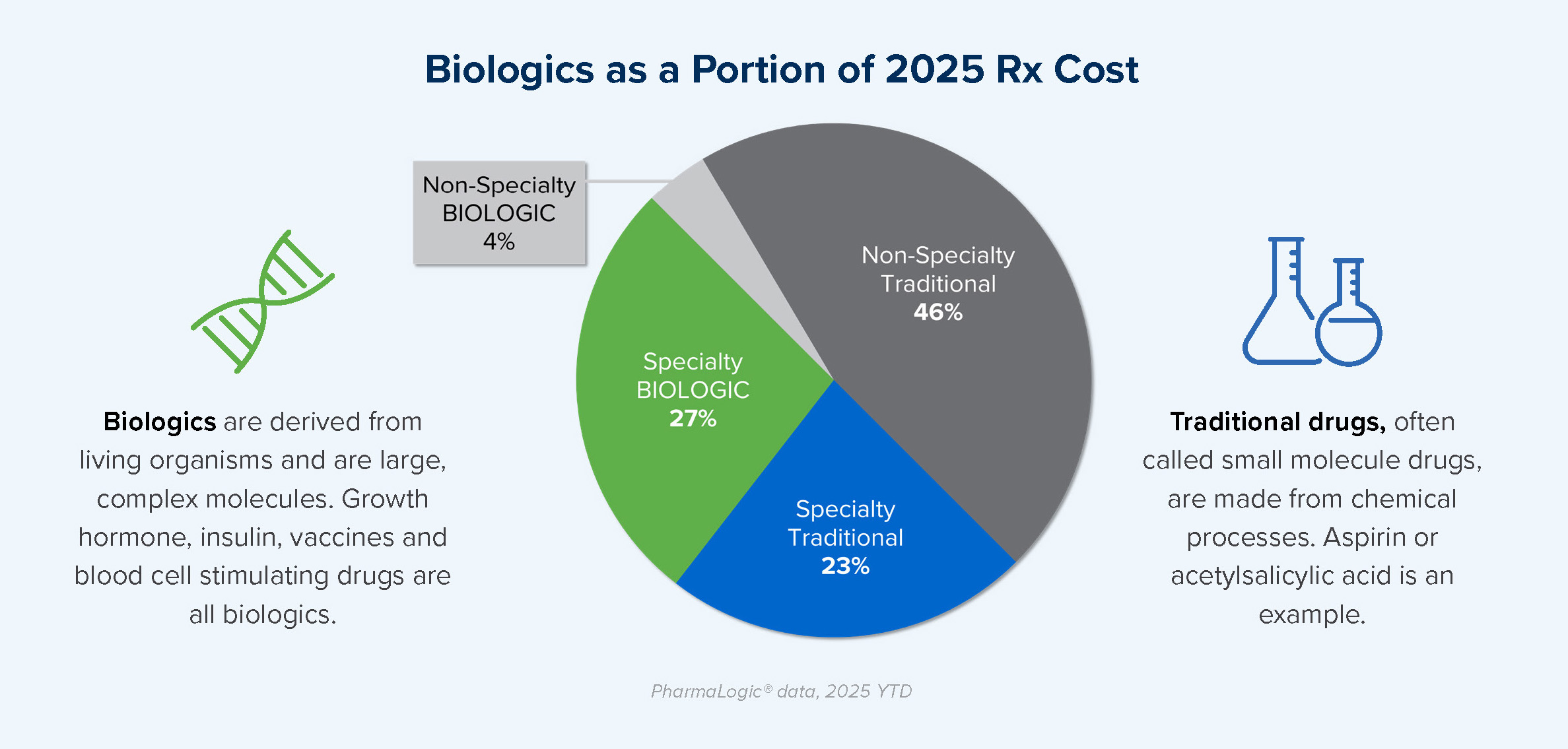 PharmaLogic® data for 2025 year-to-date reveals that more than half of specialty drug spend is related to biologic drugs. Biologics are not new, but the introduction and use of new biologics is occurring at a rapid pace.