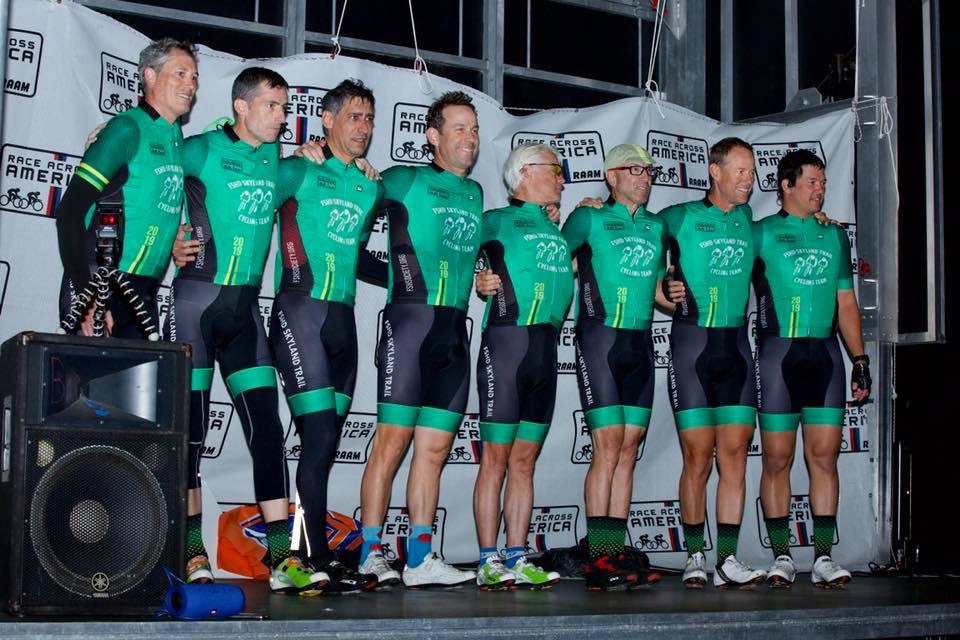 Team FSHD Skyland Trail celebrating their completion of the 3,000-mile Race Across America (From left to right), Brian McGuigan, Brian Gallagher, George Pollock, Powell Brown, Brian Jones, Michael Small, David Sanborn, and Rob Murray. Photo by Jacob Pollock.